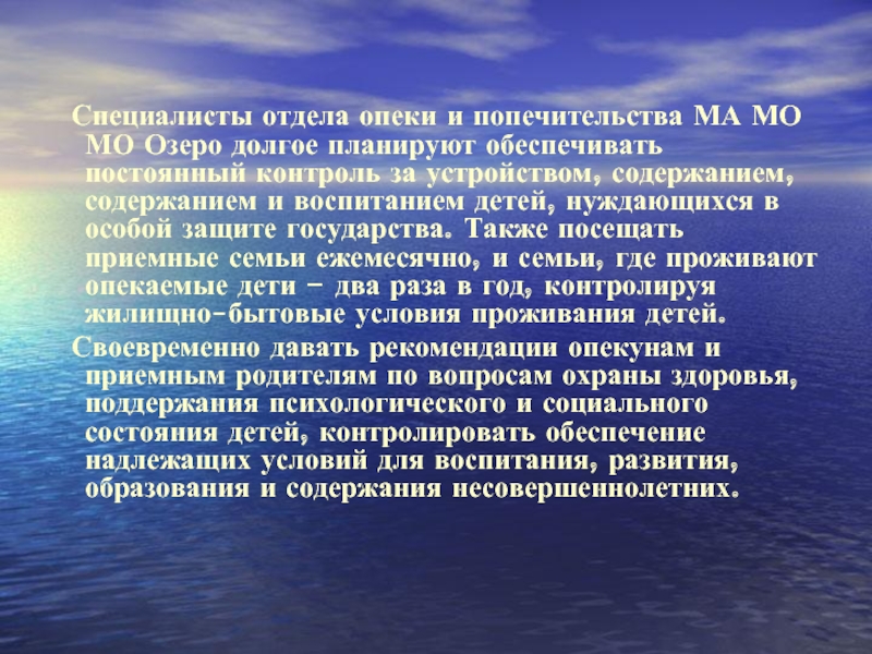 планируют обеспечивать постоянный контроль за устройством, содержанием, содержанием и воспитанием детей, нуждающихся в особой защите государства. Также посещать приемные семьи ежемесячно, и семьи, где проживают опекаемые дети – два раза в год, контролируя жилищно-бытовые условия проживания детей.