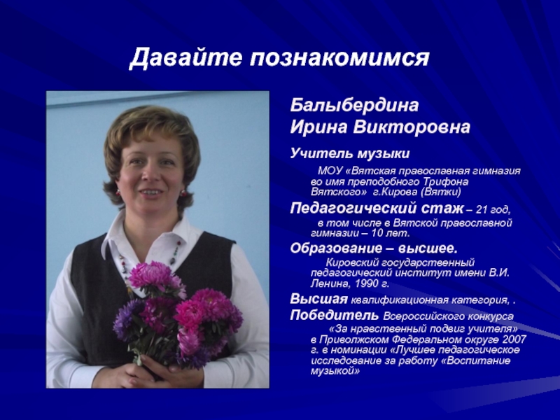 «За нравственный подвиг учителя» в Приволжском Федеральном округе 2007 г. в номинации «Лучшее педагогическое исследование за работу «Воспитание музыкой»