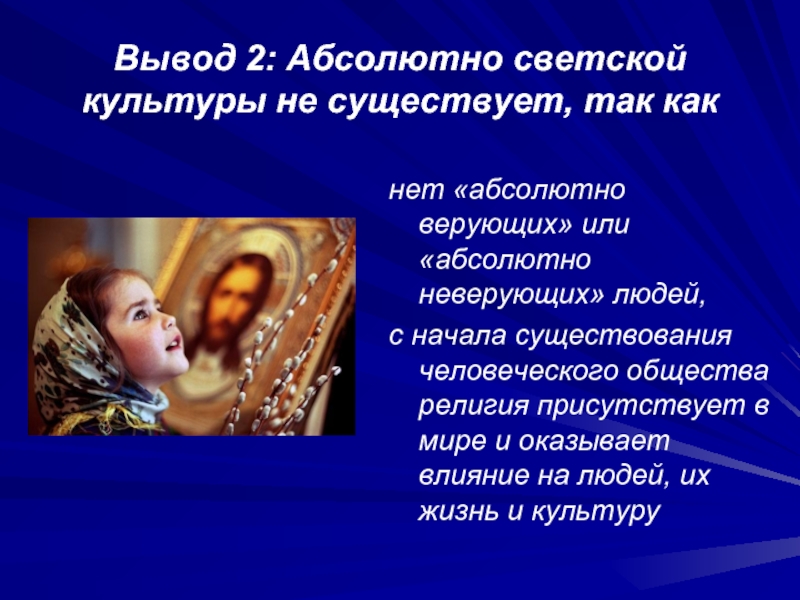 Слайд 14Вывод 2: Абсолютно светской культуры не существует, так как