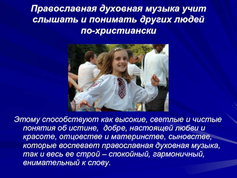 Слайд 24Православная духовная музыка учит слышать и понимать других людей