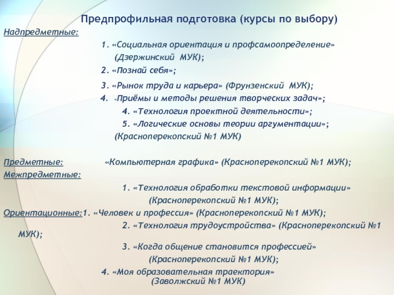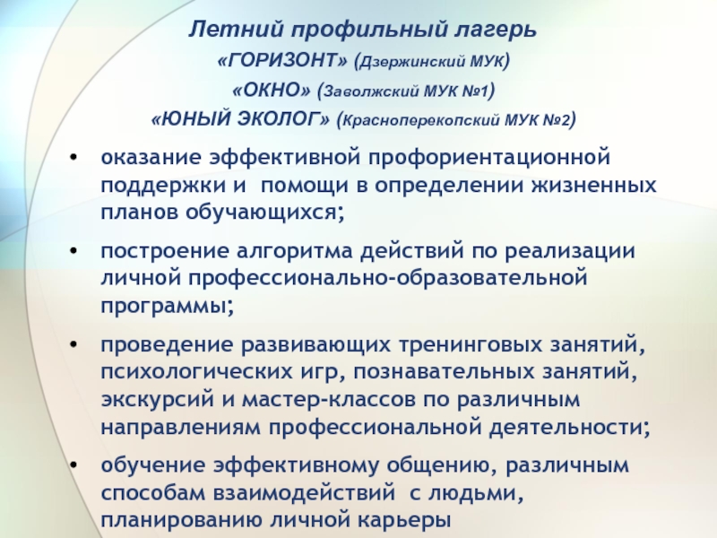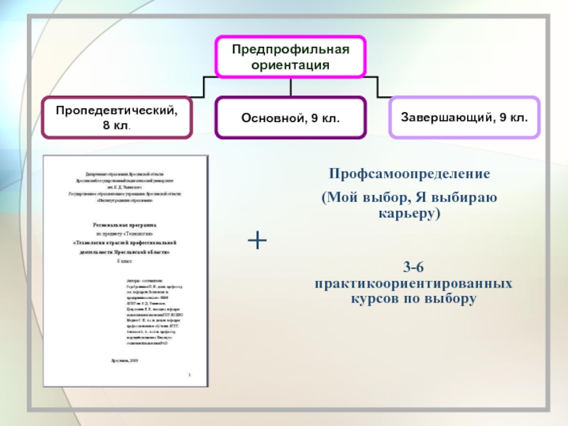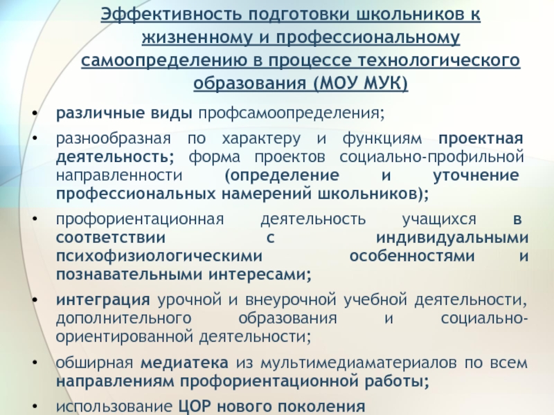 разнообразная по характеру и функциям проектная деятельность; форма проектов социально-профильной направленности (определение и уточнение профессиональных намерений школьников);