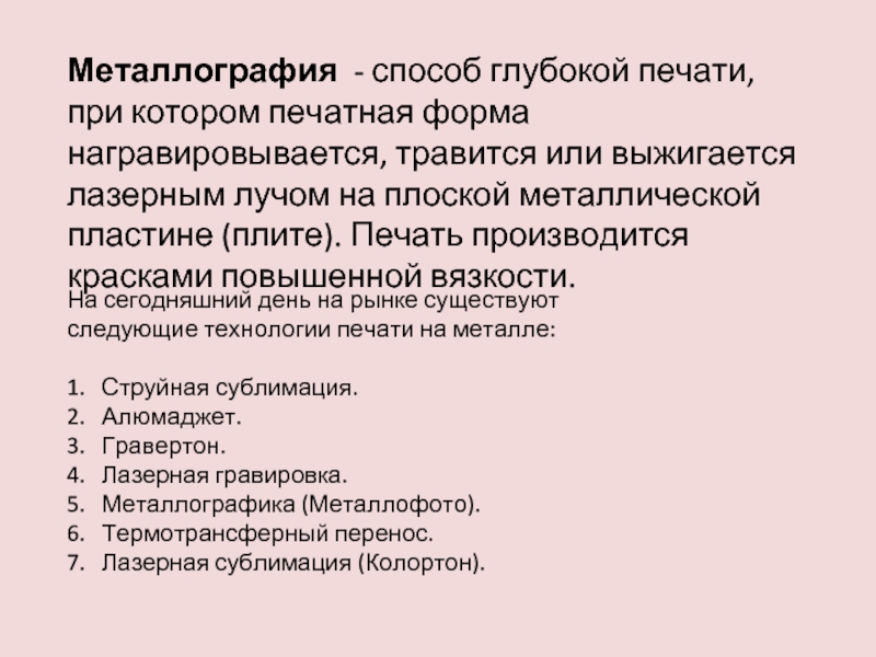 На сегодняшний день на рынке существуют следующие технологии печати на металле: