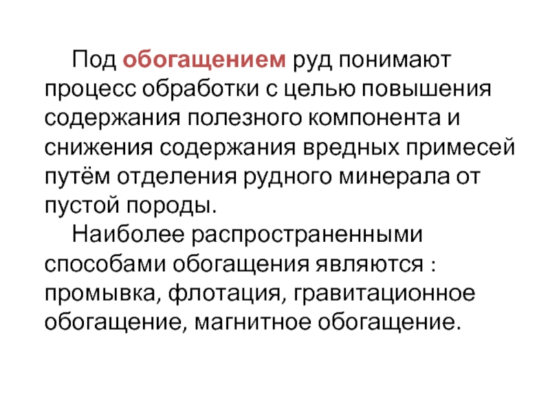 Слайд 4Под обогащением руд понимают процесс обработки с целью повышения содержания полезного