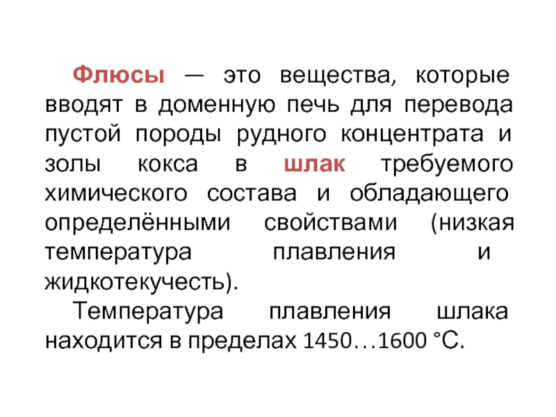 Слайд 5Флюсы — это вещества, которые вводят в доменную печь для перевода