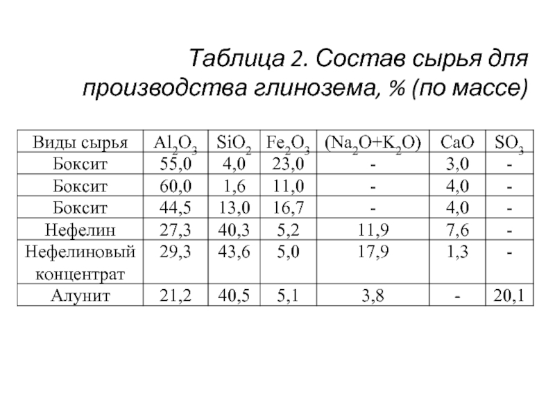 Слайд 21Таблица 2. Состав сырья для производства глинозема, % (по массе)