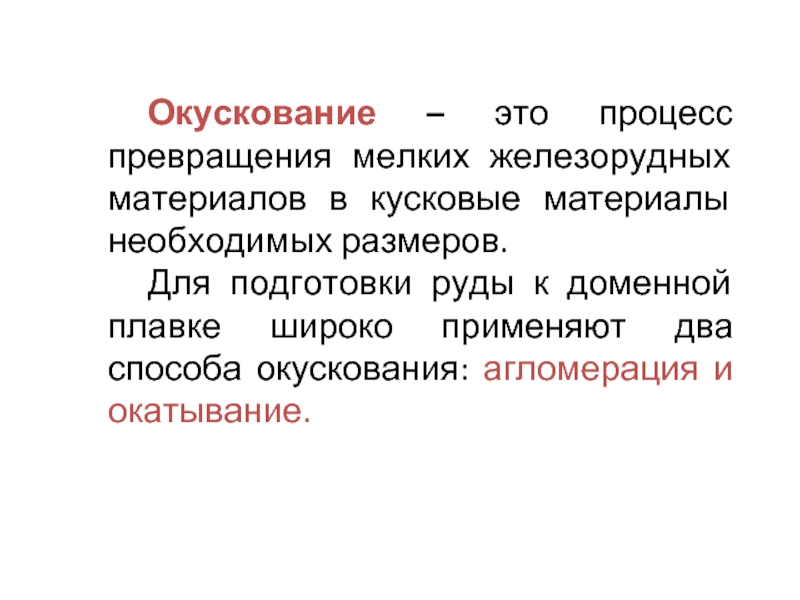 Слайд 6Окускование – это процесс превращения мелких железорудных материалов в кусковые материалы