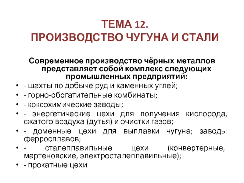 - доменные цехи для выплавки чугуна; заводы ферросплавов;