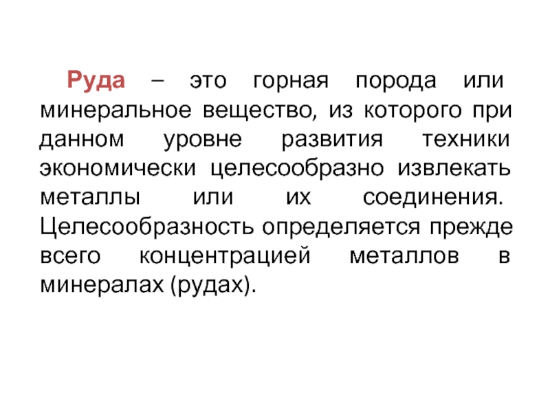 данном уровне развития техники экономически целесообразно извлекать металлы или их соединения. Целесообразность определяется прежде всего концентрацией металлов в минералах (рудах).