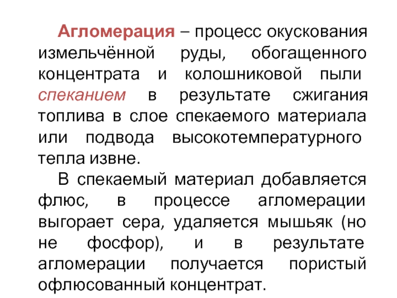 В спекаемый материал добавляется флюс, в процессе агломерации выгорает сера, удаляется мышьяк (но не фосфор), и в результате агломерации получается пористый офлюсованный концентрат.