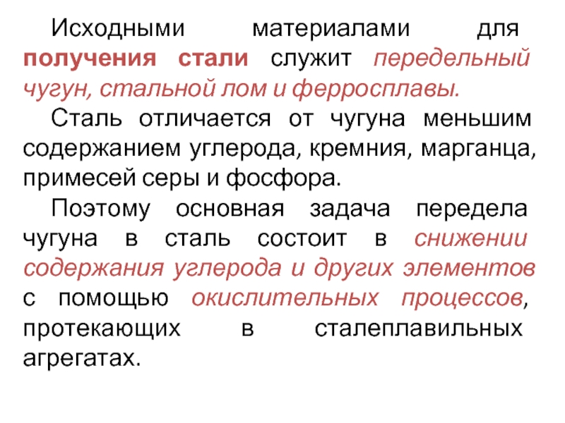 Слайд 11Исходными материалами для получения стали служит передельный чугун, стальной лом и