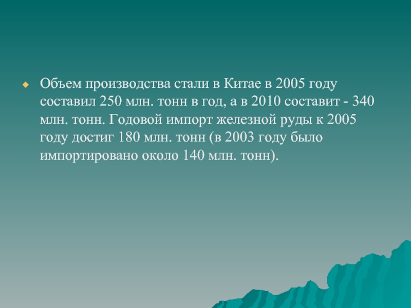тонн в год, а в 2010 составит - 340 млн. тонн. Годовой импорт железной руды к 2005 году достиг 180 млн. тонн (в 2003 году было импортировано около 140 млн. тонн).