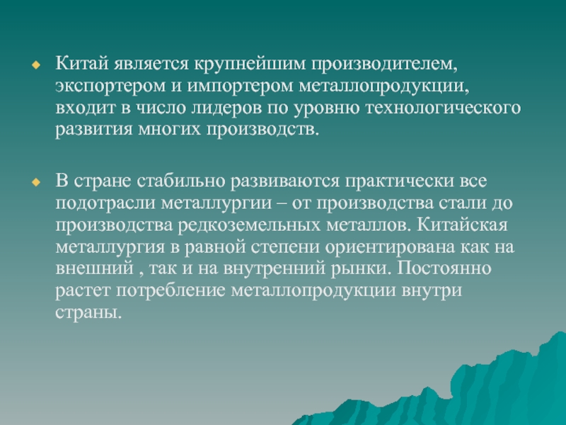 В стране стабильно развиваются практически все подотрасли металлургии – от производства стали до производства редкоземельных металлов. Китайская металлургия в равной степени ориентирована как на внешний , так и на внутренний рынки. Постоянно растет потребление металлопродукции внутри страны.