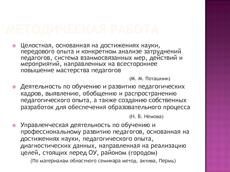 Управленческая деятельность по обучению и профессиональному развитию педагогов, основанная на достижениях науки, педагогического опыта, диагностических данных, направленная на реализацию целей, стоящих перед ОУ, районом (городом)