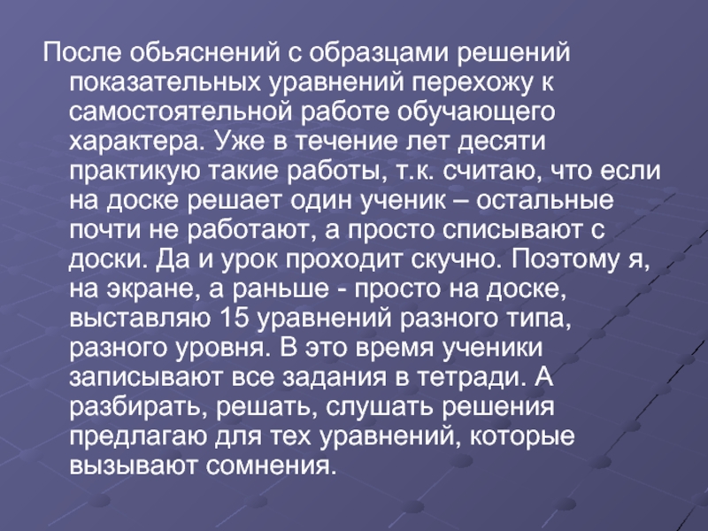 обучающего характера. Уже в течение лет десяти практикую такие работы, т.к. считаю, что если на доске решает один ученик – остальные почти не работают, а просто списывают с доски. Да и урок проходит скучно. Поэтому я, на экране, а раньше - просто на доске, выставляю 15 уравнений разного типа, разного уровня. В это время ученики записывают все задания в тетради. А разбирать, решать, слушать решения предлагаю для тех уравнений, которые вызывают сомнения.