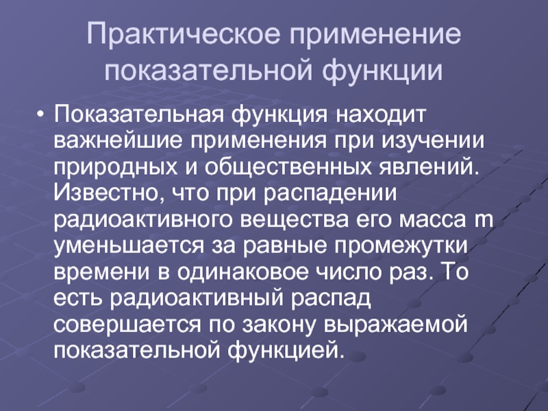 и общественных явлений. Известно, что при распадении радиоактивного вещества его масса m уменьшается за равные промежутки времени в одинаковое число раз. То есть радиоактивный распад совершается по закону выражаемой показательной функцией.