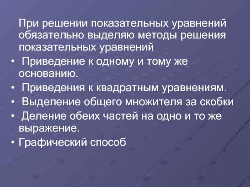 Слайд 10 При решении показательных уравнений обязательно выделяю методы решения показательных
