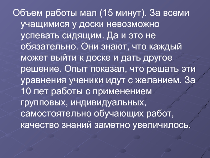 Слайд 12Объем работы мал (15 минут). За всеми учащимися у доски невозможно
