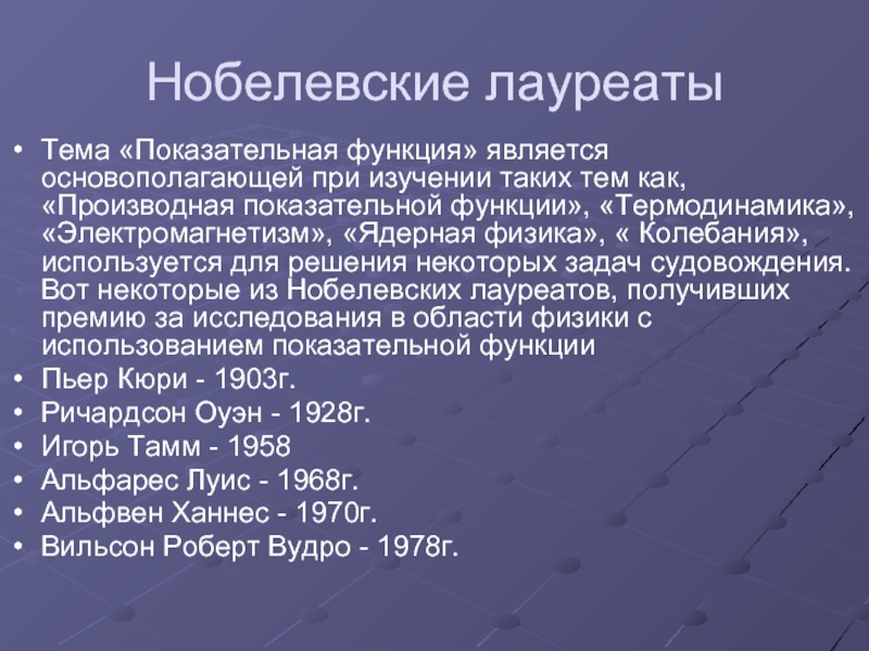 «Производная показательной функции», «Термодинамика», «Электромагнетизм», «Ядерная физика», « Колебания», используется для решения некоторых задач судовождения. Вот некоторые из Нобелевских лауреатов, получивших премию за исследования в области физики с использованием показательной функции