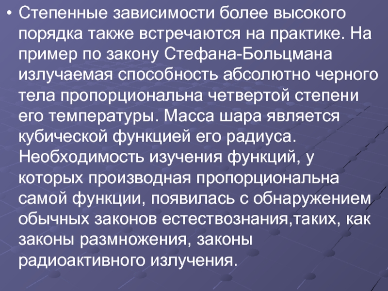 по закону Стефана-Больцмана излучаемая способность абсолютно черного тела пропорциональна четвертой степени его температуры. Масса шара является кубической функцией его радиуса. Необходимость изучения функций, у которых производная пропорциональна самой функции, появилась с обнаружением обычных законов естествознания,таких, как законы размножения, законы радиоактивного излучения.