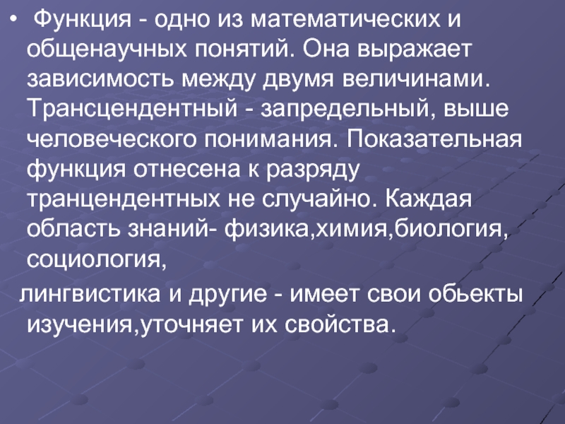 зависимость между двумя величинами.Трансцендентный - запредельный, выше человеческого понимания. Показательная функция отнесена к разряду транцендентных не случайно. Каждая область знаний- физика,химия,биология,социология,