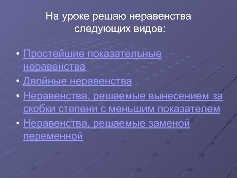 решения более сложных показательных неравенств использую те же способы, что и при решении показательных уравнений.
