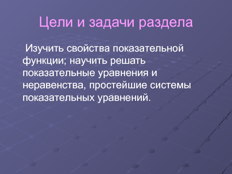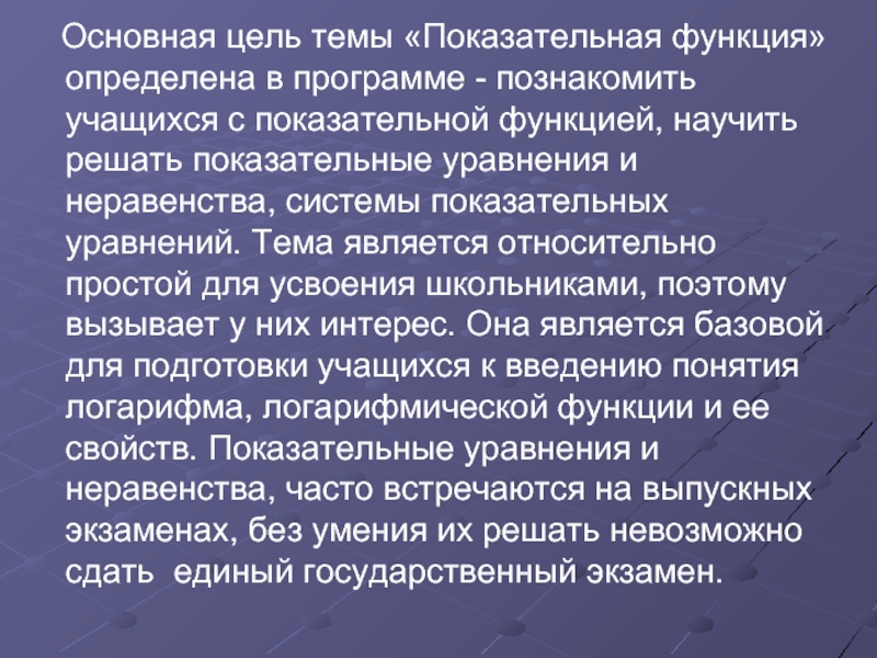 познакомить учащихся с показательной функцией, научить решать показательные уравнения и неравенства, системы показательных уравнений. Тема является относительно простой для усвоения школьниками, поэтому вызывает у них интерес. Она является базовой для подготовки учащихся к введению понятия логарифма, логарифмической функции и ее свойств. Показательные уравнения и неравенства, часто встречаются на выпускных экзаменах, без умения их решать невозможно сдать единый государственный экзамен.