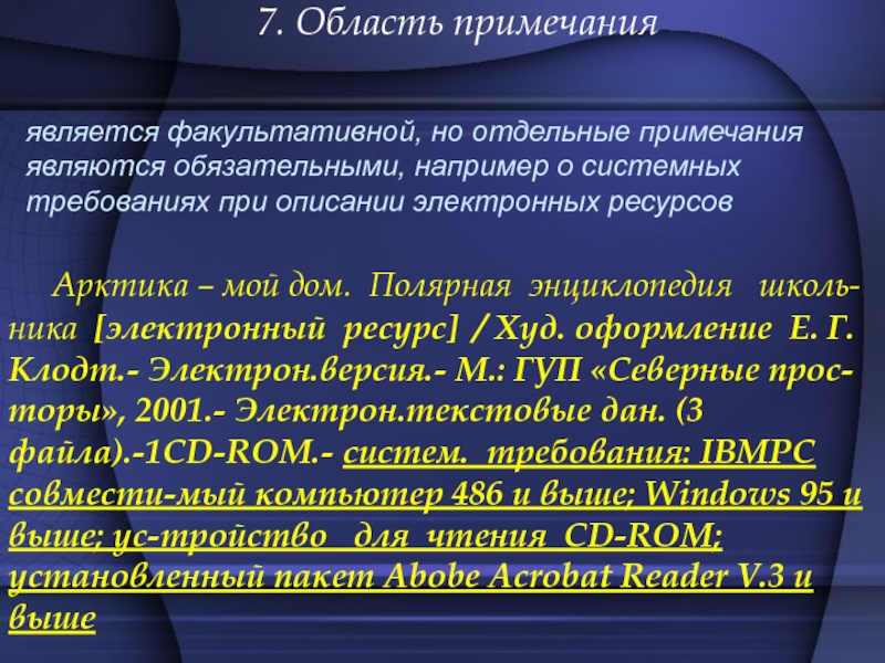 Арктика – мой дом. Полярная энциклопедия школь-ника [электронный ресурс] / Худ. оформление Е. Г. Клодт.- Электрон.версия.- М.: ГУП «Северные прос-торы», 2001.- Электрон.текстовые дан. (3 файла).-1CD-ROM.- систем. требования: IBMPC совмести-мый компьютер 486 и выше; Windows 95 и выше; ус-тройство для чтения CD-ROM; установленный пакет Abobe Acrobat Reader V.3 и выше