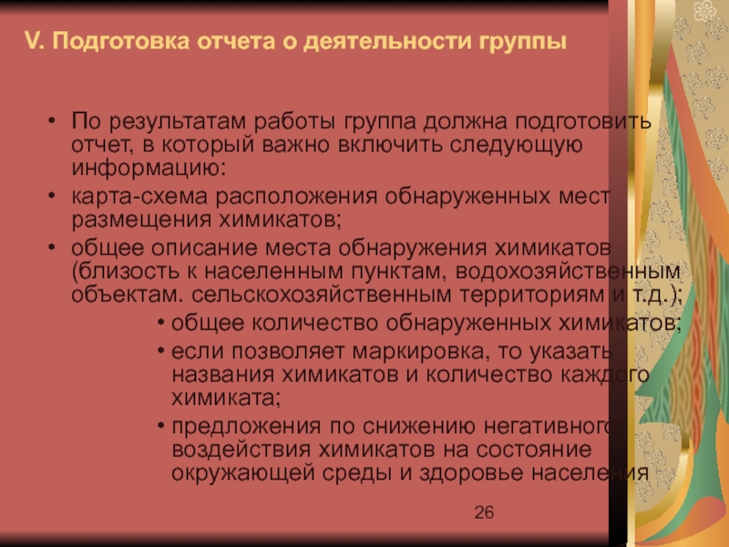 воздействие химикатов на окружающую среду (возгорание, попадание в почву или водоем, разбросанность по территории).