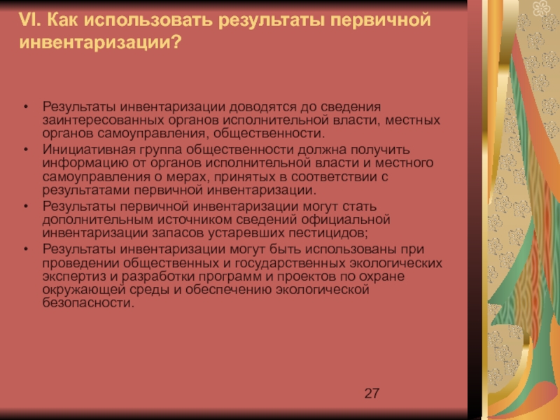 Слайд 27VI. Как использовать результаты первичной инвентаризации?