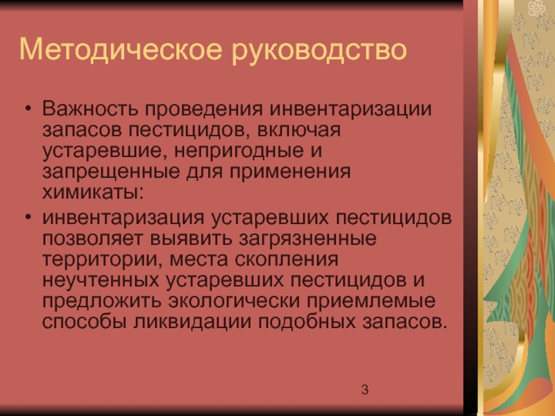 инвентаризация устаревших пестицидов позволяет выявить загрязненные территории, места скопления неучтенных устаревших пестицидов и предложить экологически приемлемые способы ликвидации подобных запасов.