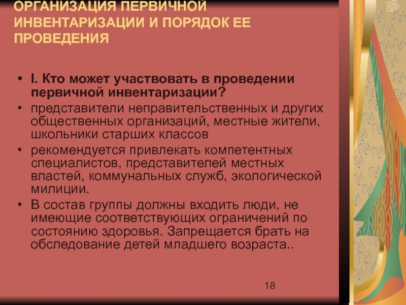 Слайд 18ОРГАНИЗАЦИЯ ПЕРВИЧНОЙ ИНВЕНТАРИЗАЦИИ И ПОРЯДОК ЕЕ ПРОВЕДЕНИЯ