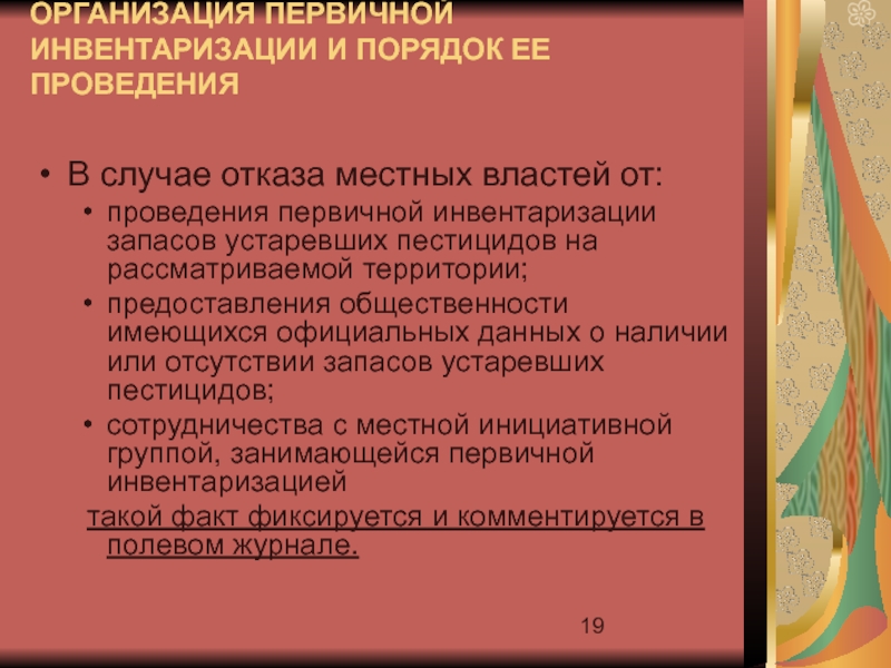 Слайд 19ОРГАНИЗАЦИЯ ПЕРВИЧНОЙ ИНВЕНТАРИЗАЦИИ И ПОРЯДОК ЕЕ ПРОВЕДЕНИЯ