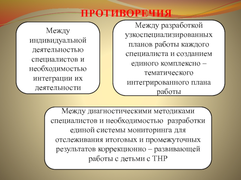 Между диагностическими методиками специалистов и необходимостью разработки единой системы мониторинга для отслеживания итоговых и промежуточных результатов коррекционно – развивающей работы с детьми с ТНР