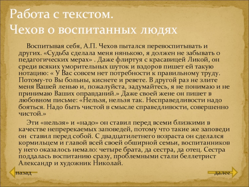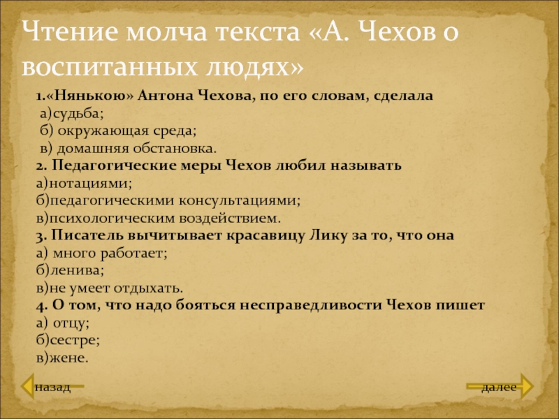 Чтение молча текста «А. Чехов о воспитанных людях»