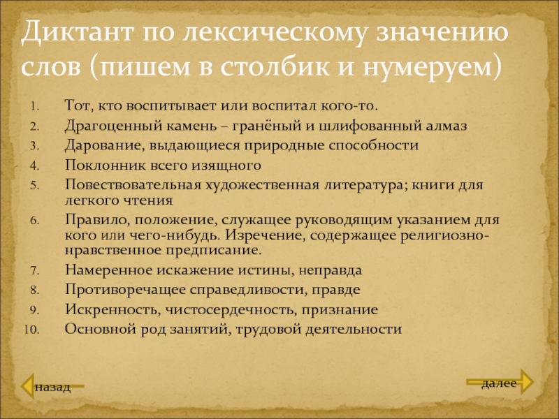 Диктант по лексическому значению слов (пишем в столбик и нумеруем)