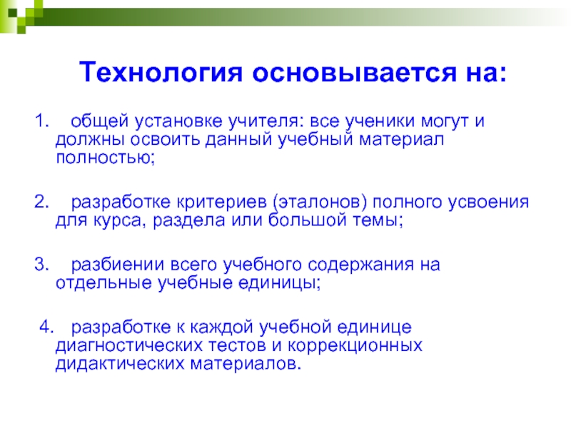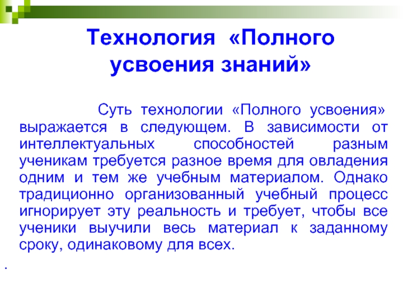 Суть технологии «Полного усвоения» выражается в следующем. В зависимости от интеллектуальных способностей разным ученикам требуется разное время для овладения одним и тем же учебным материалом. Однако традиционно организованный учебный процесс игнорирует эту реальность и требует, чтобы все ученики выучили весь материал к заданному сроку, одинаковому для всех.