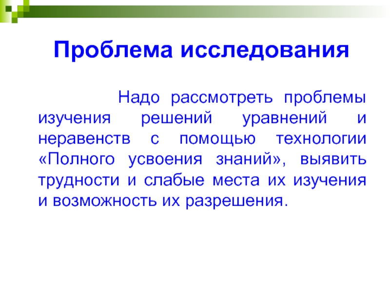 решений уравнений и неравенств с помощью технологии «Полного усвоения знаний», выявить трудности и слабые места их изучения и возможность их разрешения.