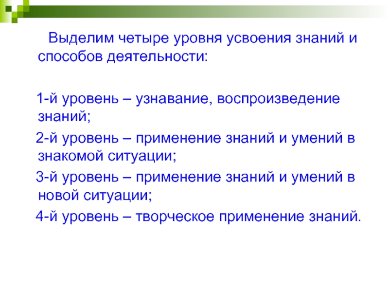 Слайд 14 Выделим четыре уровня усвоения знаний и способов деятельности: