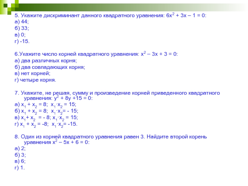 Слайд 165. Укажите дискриминант данного квадратного уравнения: 6х2 + 3х – 1