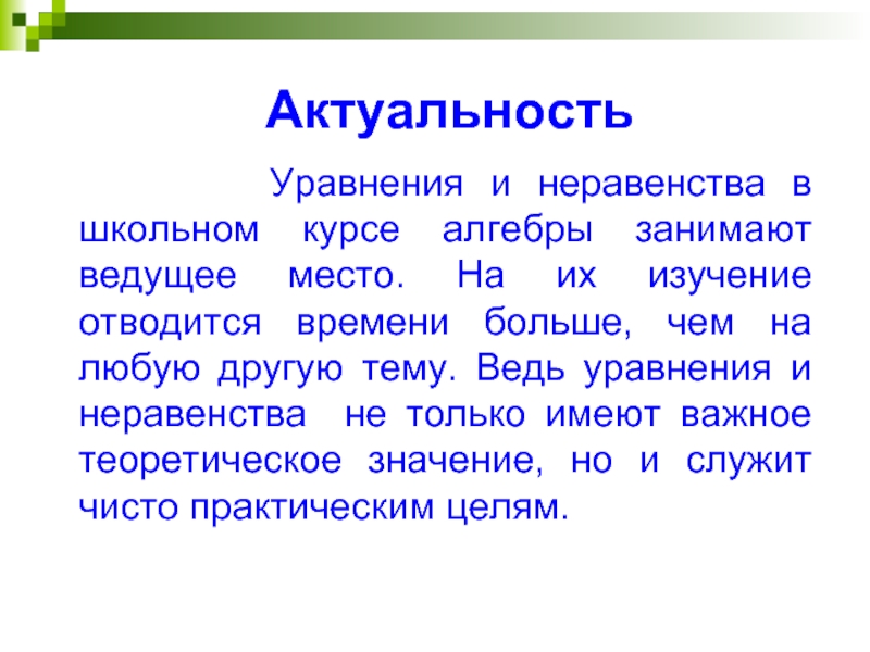 курсе алгебры занимают ведущее место. На их изучение отводится времени больше, чем на любую другую тему. Ведь уравнения и неравенства не только имеют важное теоретическое значение, но и служит чисто практическим целям.
