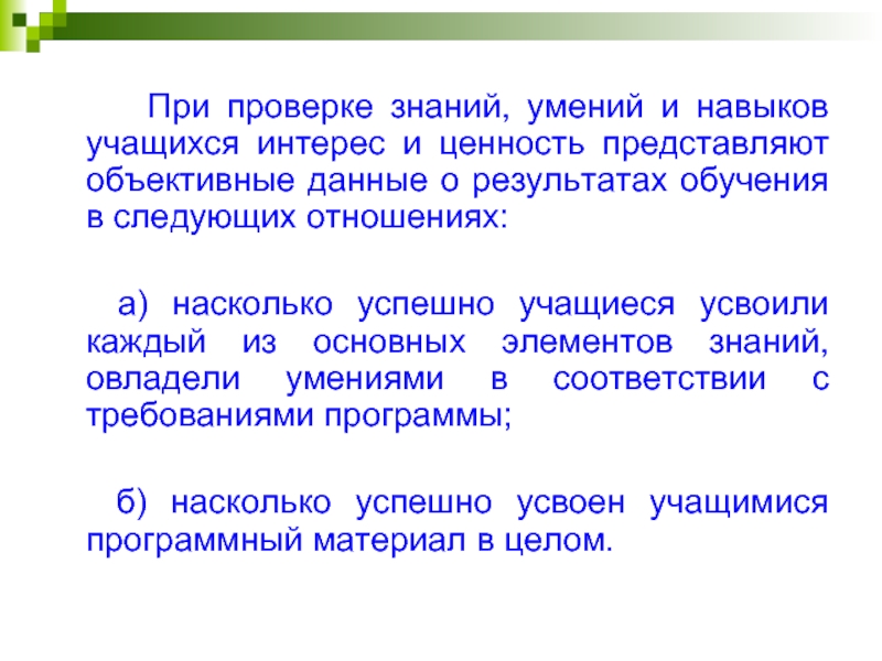 а) насколько успешно учащиеся усвоили каждый из основных элементов знаний, овладели умениями в соответствии с требованиями программы;