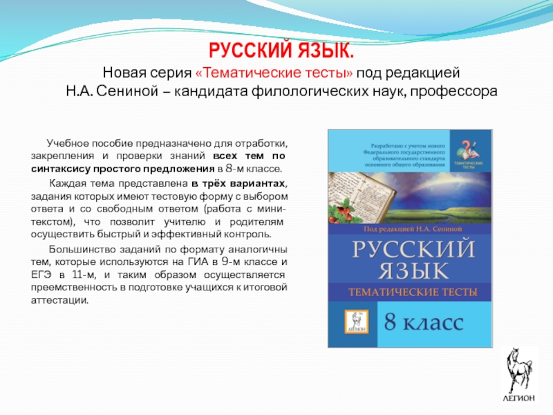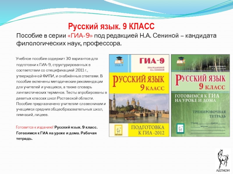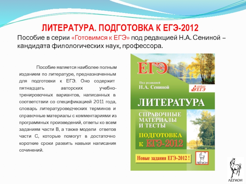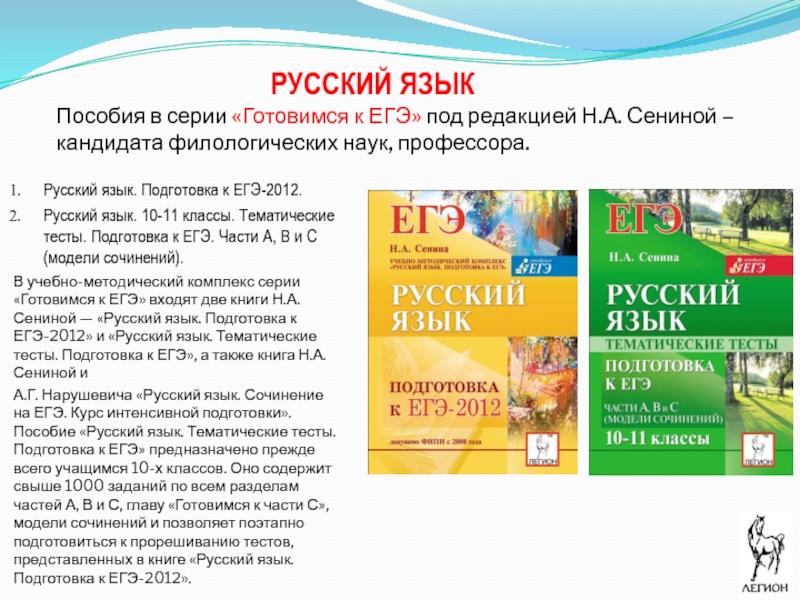 В учебно-методический комплекс серии «Готовимся к ЕГЭ» входят две книги Н.А.Сениной — «Русский язык. Подготовка к ЕГЭ-2012» и «Русский язык. Тематические тесты. Подготовка к ЕГЭ», а также книга Н.А. Сениной и