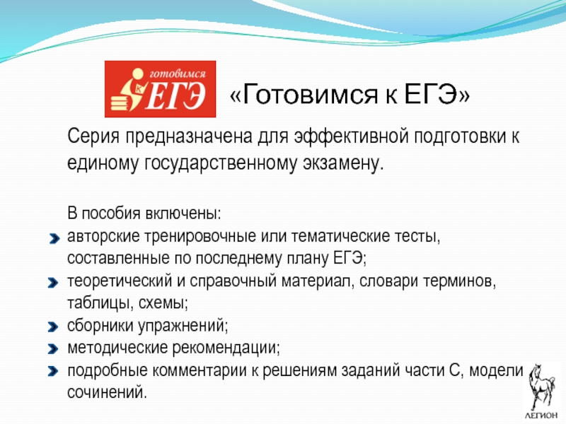 А.Г. Нарушевича «Русский язык. Сочинение на ЕГЭ. Курс интенсивной подготовки». Пособие «Русский язык. Тематические тесты. Подготовка к ЕГЭ» предназначено прежде всего учащимся 10-х классов. Оно содержит свыше 1000 заданий по всем разделам частей А, В и С, главу «Готовимся к части С», модели сочинений и позволяет поэтапно подготовиться к прорешиванию тестов, представленных в книге «Русский язык. Подготовка к ЕГЭ-2012».