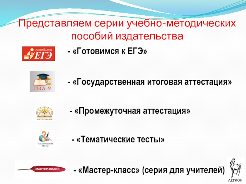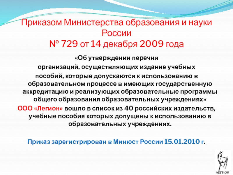 ООО «Легион» вошло в список из 40 российских издательств, учебные пособия которых допущены к использованию в образовательных учреждениях.