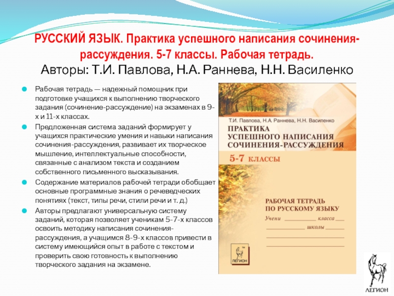 Рабочая тетрадь — надежный помощник при подготовке учащихся к выполнению творческого задания (сочинение-рассуждение) на экзаменах в 9-х и 11-х классах.