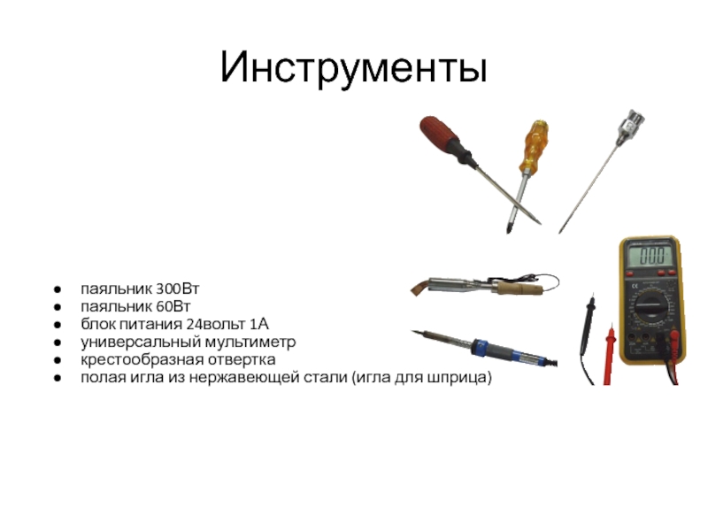 Отвертки прямая и крестовая, пинцет, кусачки (бокорезы монтажные) .