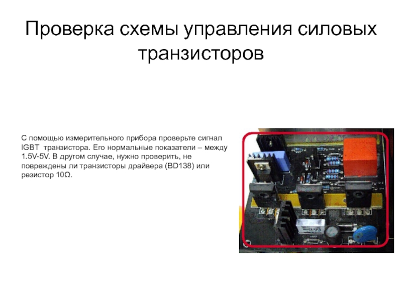транзистора. Его нормальные показатели – между 1.5V-5V. В другом случае, нужно проверить, не повреждены ли транзисторы драйвера (BD138) или резистор 10Ω.