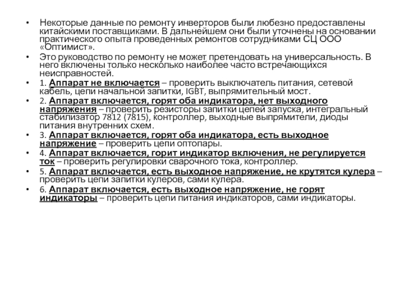 Слайд 2Некоторые данные по ремонту инверторов были любезно предоставлены китайскими поставщиками. В