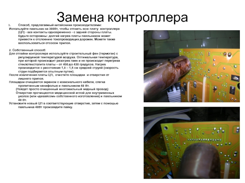 плату контроллера (ЦП) - все контакты одновременно - с задней стороны платы. Будьте осторожны: долгий нагрев платы паяльником может привести к отслоению токопроводящих дорожек. Можете также воспользоваться отсосом припоя.