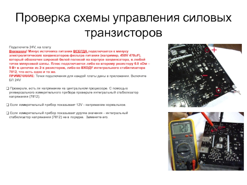 режиме короткого замыкания. (цепь эмитер-коллектор, КЭ). В схеме несколько транзисторов включены параллельно, поэтому, если обнаружено короткое замыкание, необходимо выпаивать транзисторы по одному и проверять на наличие пробоя. Также необходимо проверить «обвеску» транзисторов.